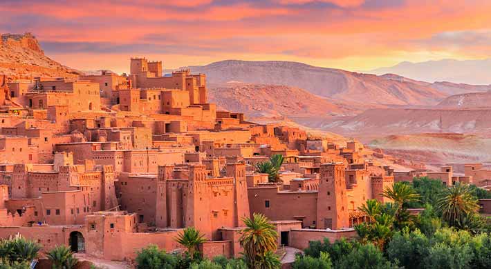 The Dades Valley is a palette of red cliffs and soft lights. Terraced fields bloom in pink and green. As you move further east, the terrain shifts again — into the golden curves of the Sahara Desert.