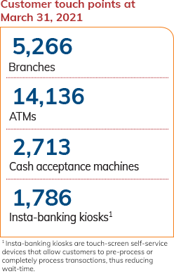 Digital initiatives have played a key role in driving growth and efficiency in the retail business. These initiatives have improved the efficiency of branches. The Bank is now able to serve more customers at its existing branches and has enabled employees to perform more value-added activities. The Bank periodically reviews branches based on customer footfalls and economic activities to ensure optimal distribution of the branch network. We added 922 cash acceptance machines and 148 insta-banking kiosks during fiscal 2021.