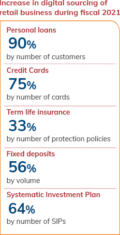 During fiscal 2021, with challenges posed by the Covid-19 pandemic, we responded quickly to enable customers to meet their financial requirements safely. About 97% of the Bank’s branches were functional with reduced working hours during the months of lockdown in April-May 2020. We deployed mobile ATM vans for the benefit of the public residing in and around containment zones. A video-based Know-Your-Customer process (Video KYC) was launched, which empowered retail customers to complete their onboarding process for savings accounts, personal loans and Amazon Pay credit cards through a contactless video interaction. We also launched WhatsApp banking to enable retail customers to undertake a range of banking requirements from their homes during the pandemic. Further, a cardless cash withdrawal facility was enabled at our ATMs.