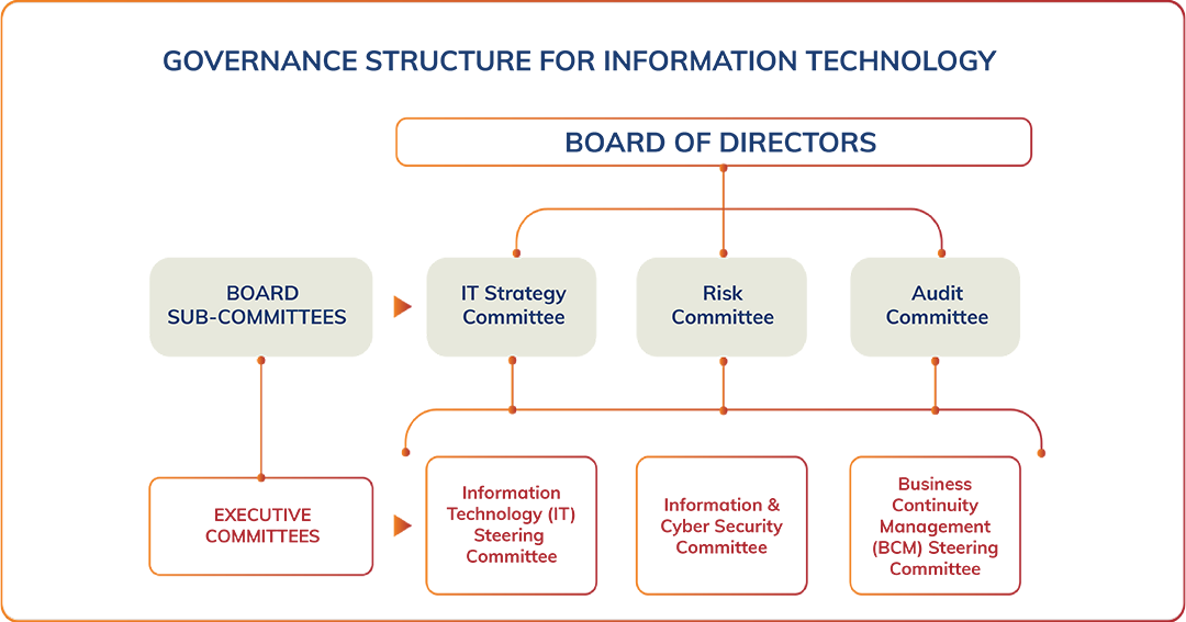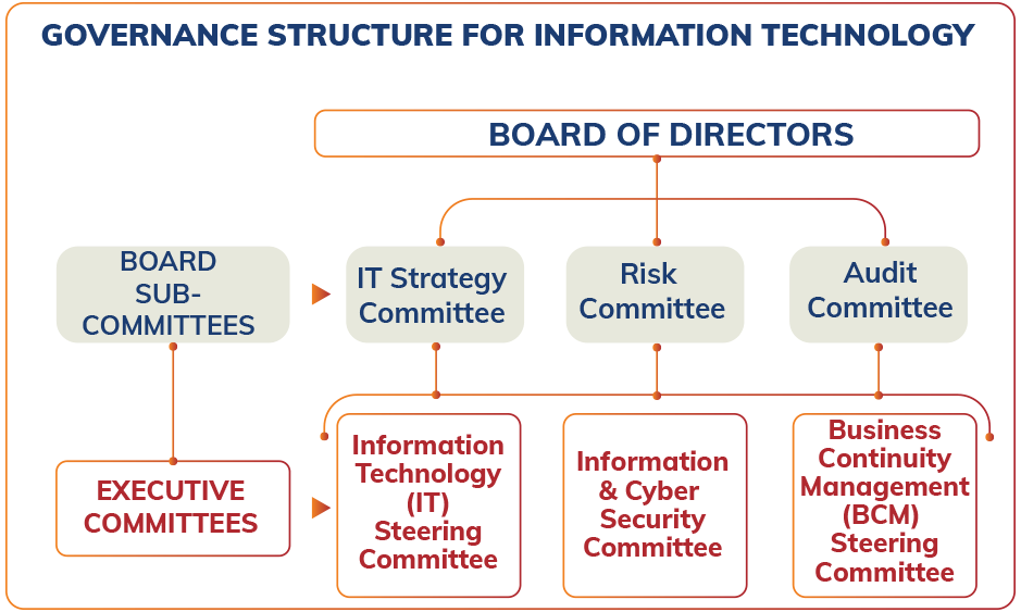 The governance structure for management of information/cyber security risk is helmed by the IT Strategy Committee, the Risk Committee and Audit Committee, all being Board-level Committees and chaired by Independent Directors. At the executive management level, there are specialised Committees to review key areas of IT and cyber risk. These include the Information and Cyber Security Committee, IT Steering Committee and the Business Continuity Management (BCM) Steering Committee which have diverse cross-functional members and well-defined terms of reference. Proceedings of these Committees are reported to the IT Strategy Committee. Further, the BCM Steering