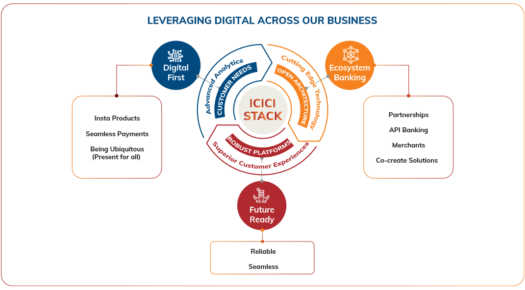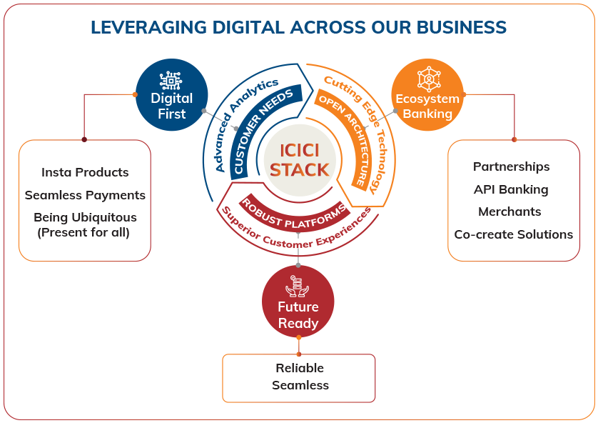 Leveraging digital technology is core to every aspect of our business. We leverage digital to decongest and streamline processes; analyse and understand customer needs; and improve customer onboarding and the continuing customer experience. The ICICI STACK, API Banking portal, iMobile, InstaBIZ and internet banking platforms as well as bespoke solutions for corporate and institutional customers provide seamless banking services digitally and enhance customers' transacting experiences. Partnerships with technology companies and platforms with large customer bases and transaction volumes offer unique opportunities for growth, and enhancing service delivery and customer experience. The Bank also has a start-up investment and partnerships team to collaborate with and invest in fintech startups and co-develop products aligned with our digital roadmap.