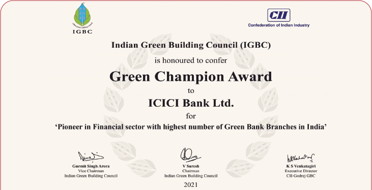 ICICI Bank received IGBC Green Champion Award for having the highest number of green branches in India. The Bank has 126 green branches and offices at March 31, 2022