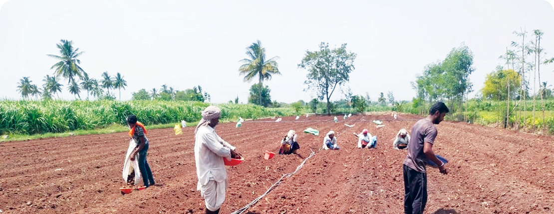 Sowing of turmeric in lieu of crops with high water consumption (top) and fully grown turmeric crops (bottom) in Bagalkot district, Karnataka