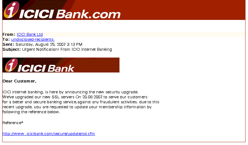 Below is a sample of a fraudulent e-mail that can be sent to ICICIBank.com customers. It purports to be from ICICIBank.com but it is not. Its intent is to get you to enter sensitive information about your account and to then use this information to commit fraud.